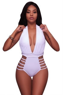 - Solid White Halter-Style Bikini Swimsuit With Front Tie Closures on Top and Side Ties on the Bottom
