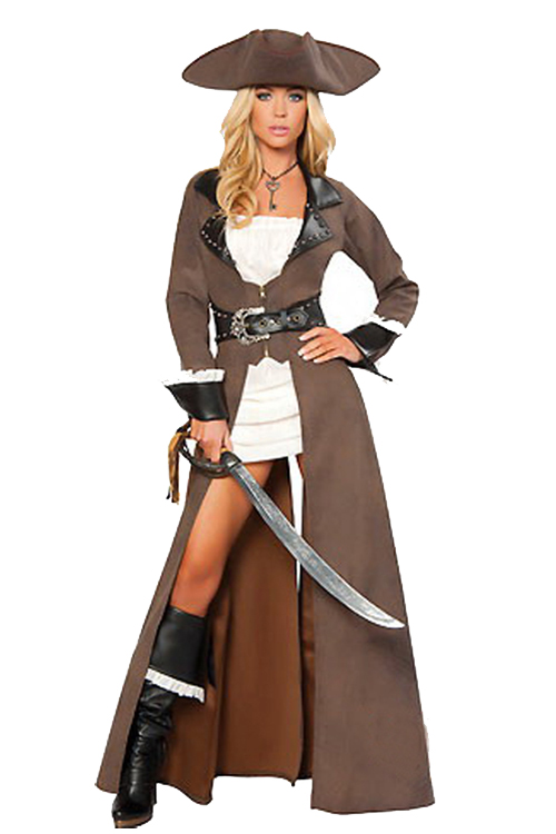 Home > Costumes > Alluring Pirate Charmer Soft Brown Long Gown Longsleeve Black Edges Pattern Belt Partly Covering White Tight Mini Dress