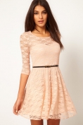 Home > Clothing > Fashion Dress > Sexy Peach Colored Mini Dress with 3/4 Sleeves and Lace Overlay